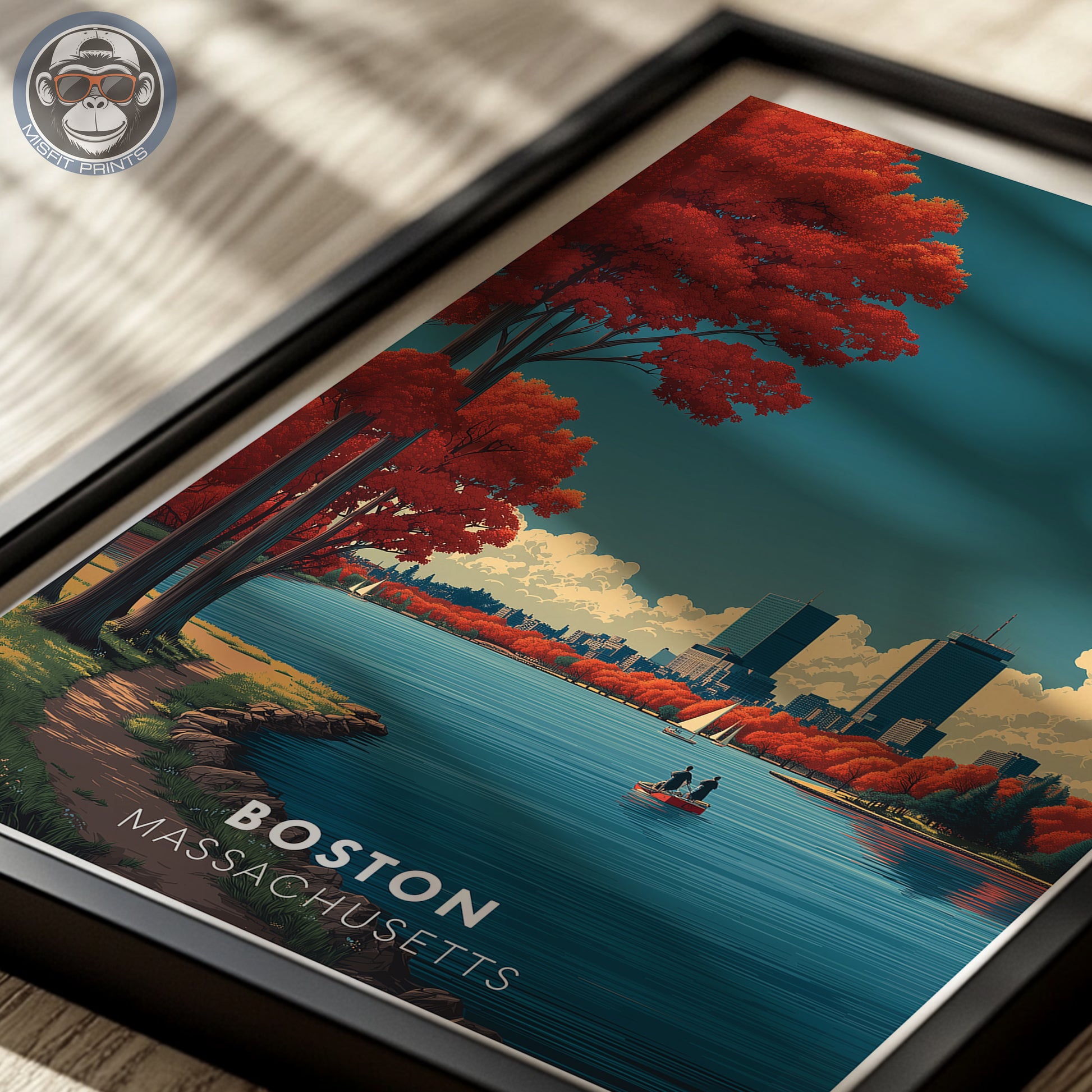 A physical print/poster of Boston, Massachusetts, capturing the city’s stunning skyline and vibrant fall colors reflected along the Charles River. This piece beautifully highlights sailboats gliding across the water and the iconic Prudential and Hancock Towers in the distance—perfect for anyone who loves New England, Boston, or travel art.