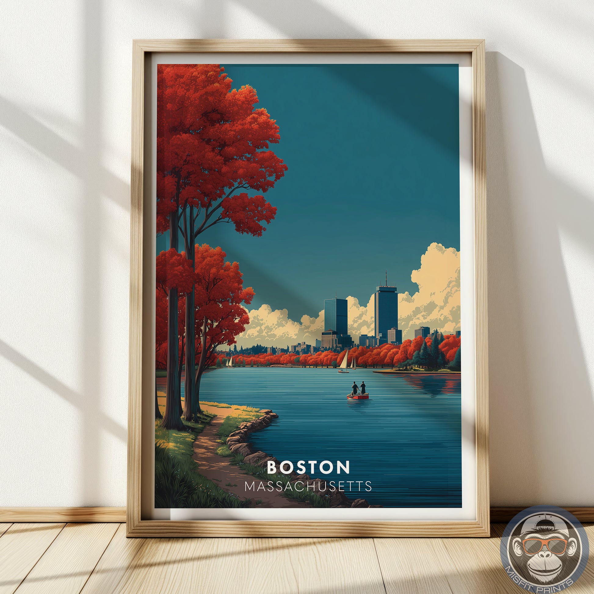 Boston, Massachusetts Travel Poster Print | Autumn Skyline Art | Charles River Sailboats