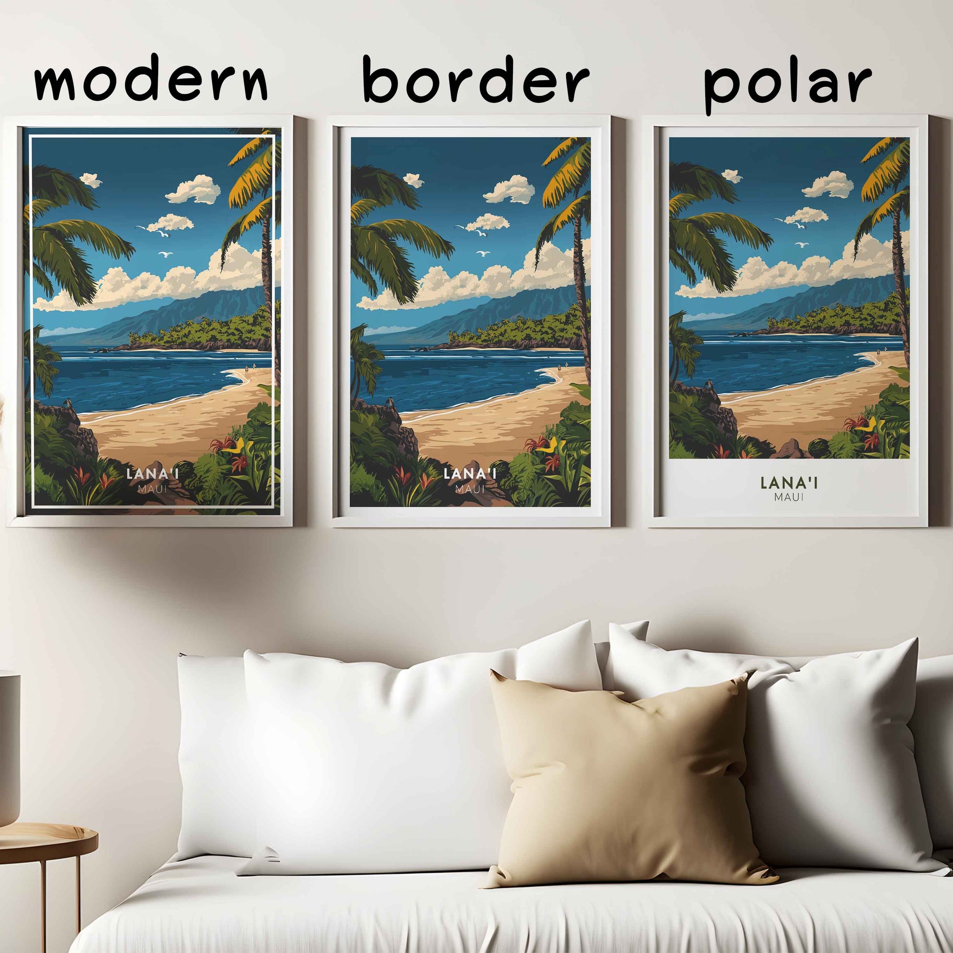 Perfect for anyone who loves travel, surf culture, or the natural elegance of the Pacific, this Maui wall art brings warmth and calm to any interior. Its soothing palette of deep blues and greens pairs beautifully with coastal, modern, or bohemian décor styles. Whether it reminds you of a past Hawaiian adventure or sparks your next one, this Lana’i travel poster radiates the essence of aloha.