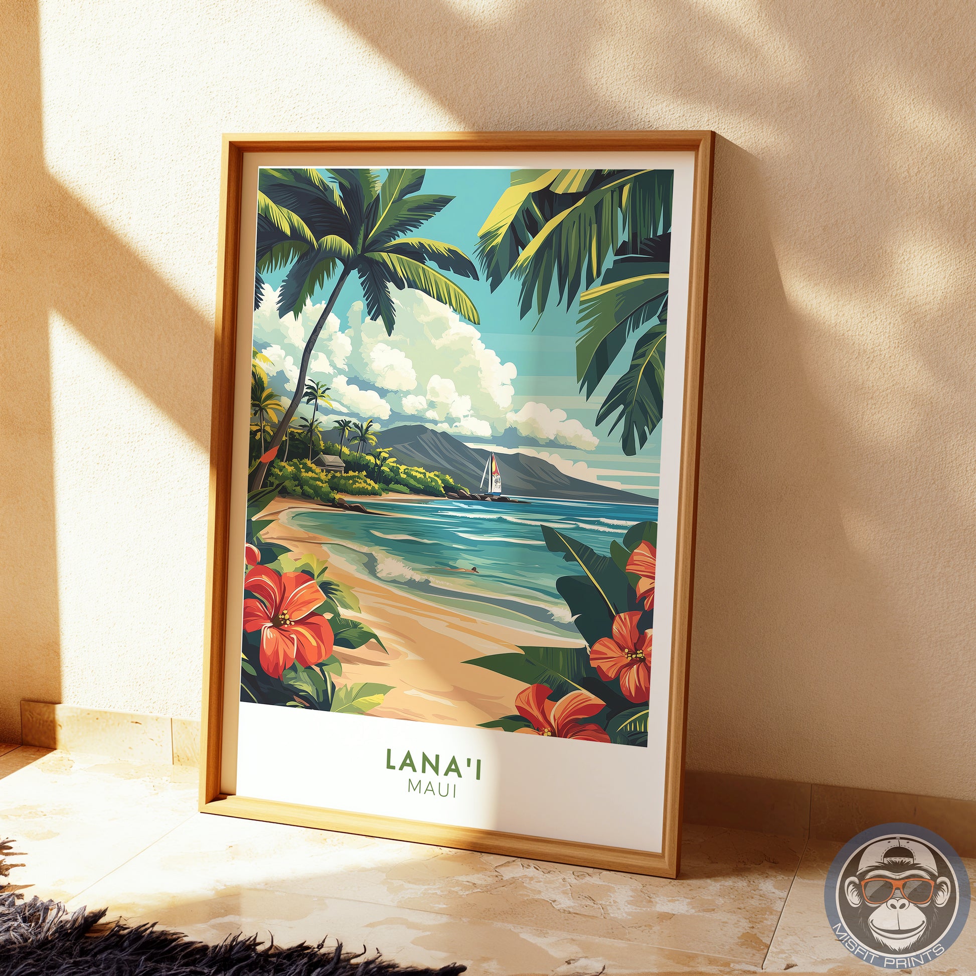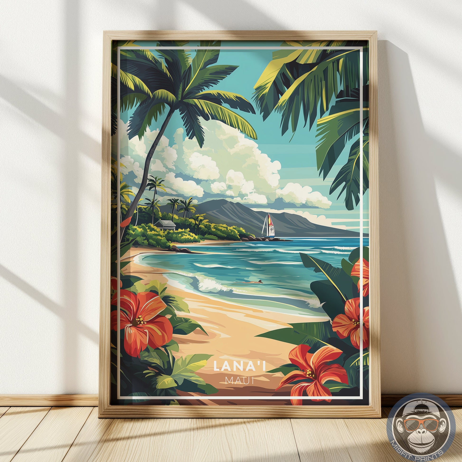 Lanai Maui Hawaii Poster | Tropical Beach Wall Art, Hawaiian Travel Print, Palm Tree Coastal Decor, Retro Island Illustration