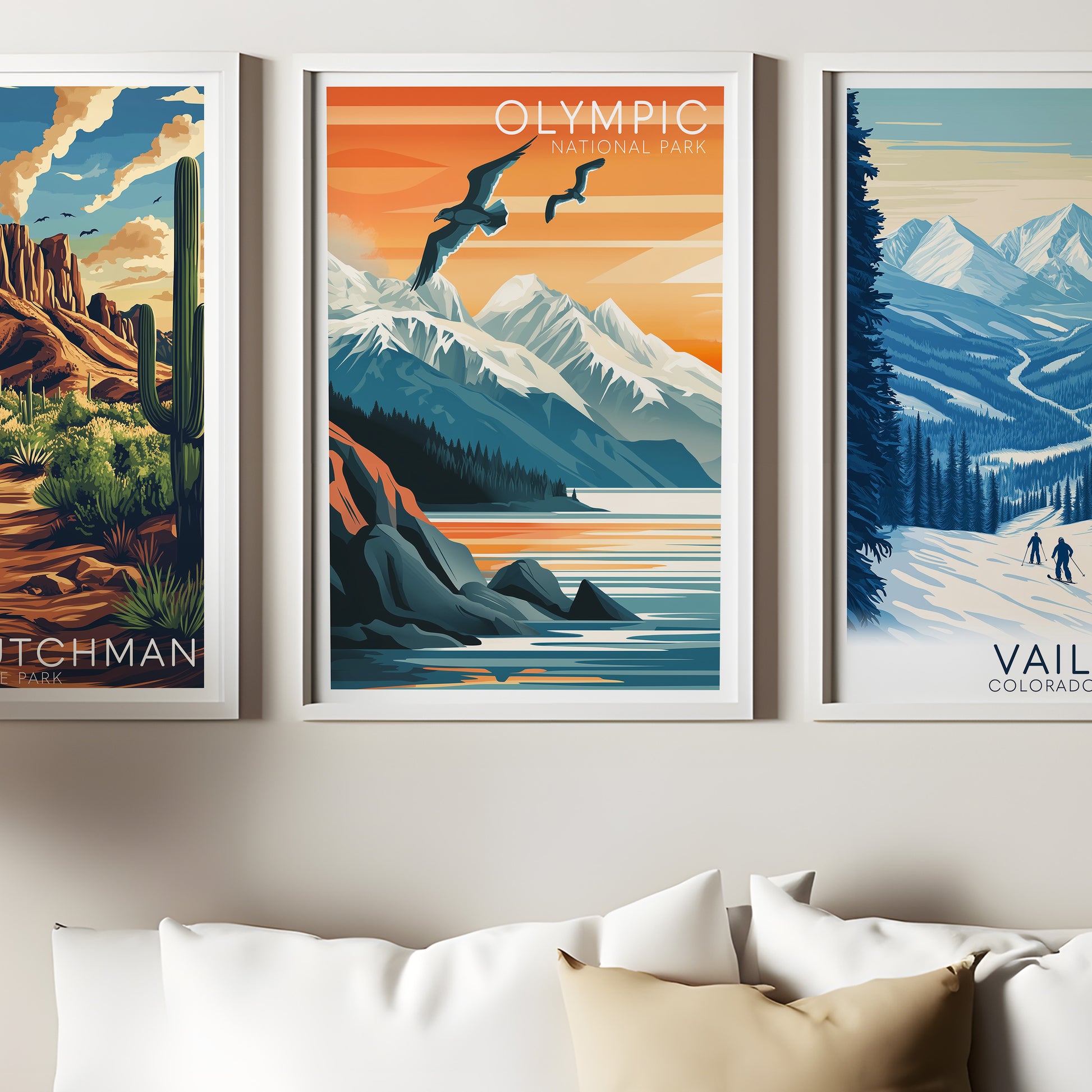 This vintage-style travel print celebrates the lush rainforests, rugged coastline, and soaring peaks that make Olympic one of the most diverse national parks in the U.S. Perfect for nature lovers, hikers, and retro art fans looking to bring the wilderness indoors.